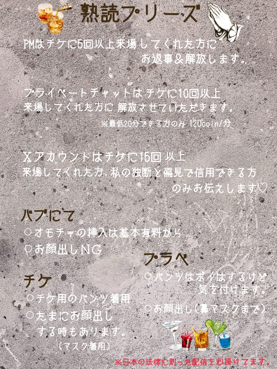 ◯ライブ配信の録画 その録画の転載 販売を禁止します。 Live streaming recording Reproduction and sale of the recording are prohibited. ◯日本の法律を守って配信してるので性器の露出の強要はお辞めください。 ◯暴言や荒らし行為等は他の視聴者様へのご迷惑になるので、お辞めください。 Ranting and vandalism will cause inconvenience to other viewers, so please stop. ◯過度な要求をしないでください。 Please don't make excessive demands. ◯視聴者様同士での言い合いや喧嘩はしないでください。 ◯コインなしのリクエストにはお応え出来ません。 プレゼントメニューにないものはコインを添えてリクエストしてください。 We cannot respond to requests without coins. Please request items that are not on the gift menu with coins. ◯全てのリクエストが出来るわけでないです。 ◯過去のチケチャ、グルチャの内容は配信内でコメントしないでください。 ◯配信動画や画像の無断転載は法的措置を取ります。 Unauthorized reproduction of broadcast videos and images will take legal action. ◯マナーのない方やルールの守れない方はミュート/ブロックさせていただく場合があります。 ◯個人のプライバシーを特定するような発言、不快なコメントをされた方はミュート/ブロックさせていただきます。